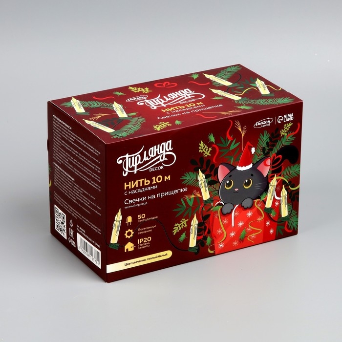 Гирлянда «Нить» 10 м с насадками «Свечи на прищепке», IP20, тёмная нить, 50 LED, свечение тёплое белое, 220 В