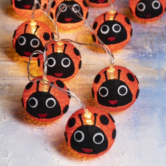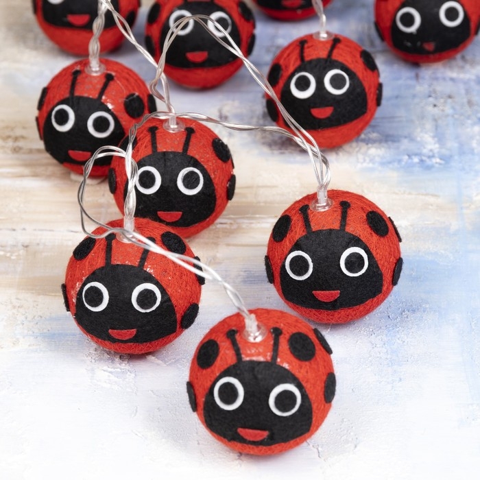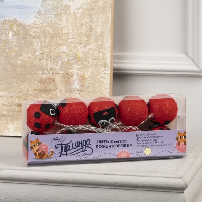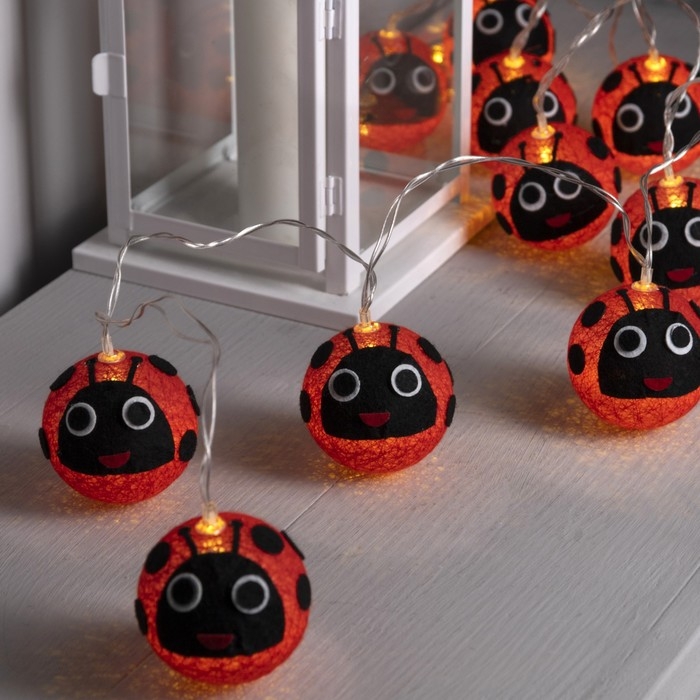 Гирлянда «Нить» 2 м с насадками «Божья коровка», IP20, прозрачная нить, 10 LED, свечение тёплое белое, AAх2