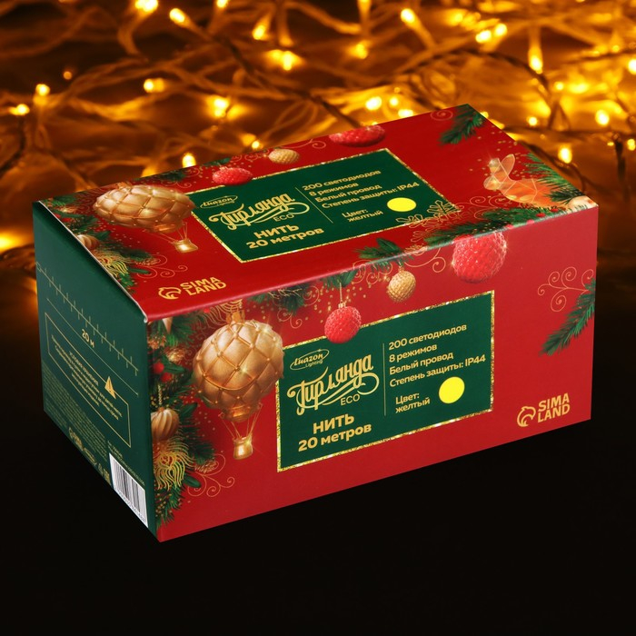 Гирлянда «Нить» 20 м, IP44, белая нить, 200 LED, свечение жёлтое, 8 режимов, 220 В