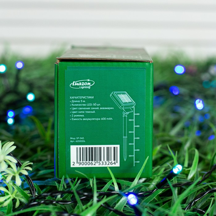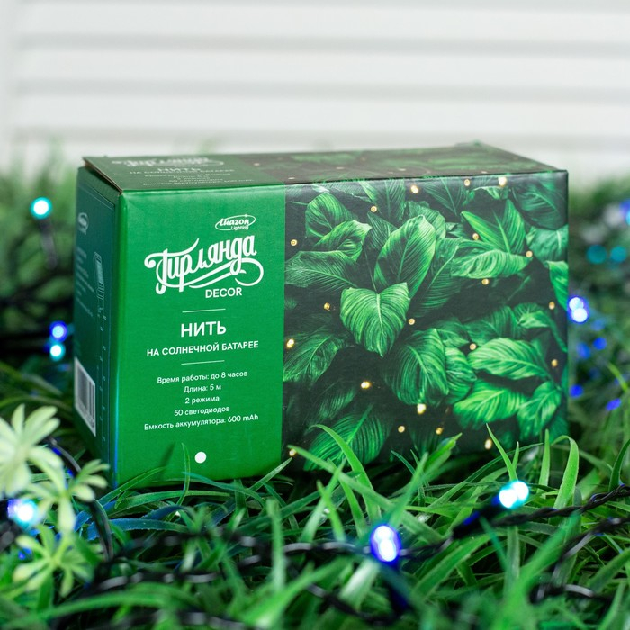 Гирлянда «Нить» 5 м, IP44, тёмная нить, 50 LED, свечение синее/аквамарин, 2 режима, солнечная батарея
