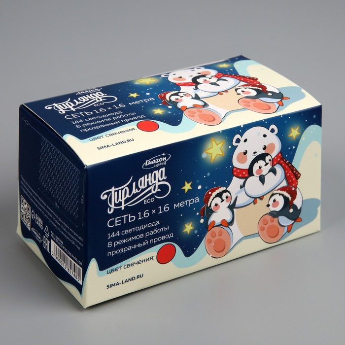 Гирлянда «Сеть» 1.6 × 1.6 м, IP20, прозрачная нить, 144 LED, свечение красное, 8 режимов, 220 В