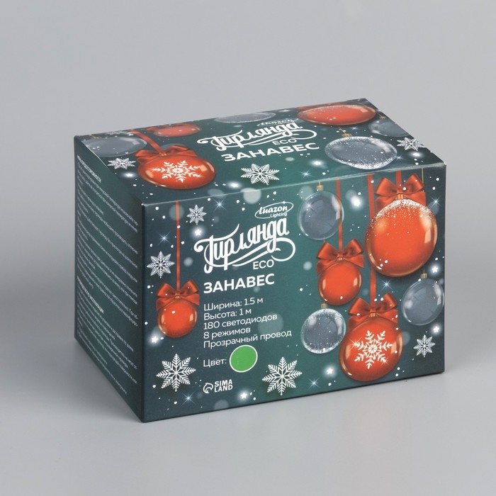 Гирлянда «Занавес» 1.5 × 1 м, IP20, прозрачная нить, 180 LED, свечение зелёное, 8 режимов, 220 В