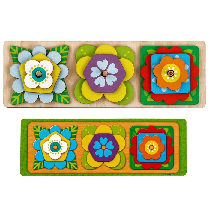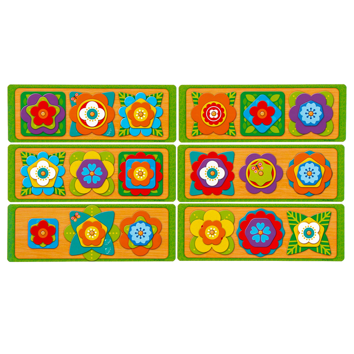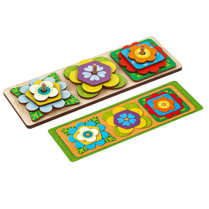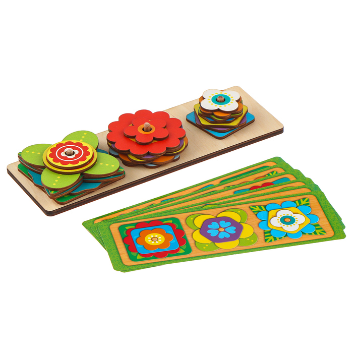 В набор входит: древянная основа и 20 деталей, 6 карточек со схемами.