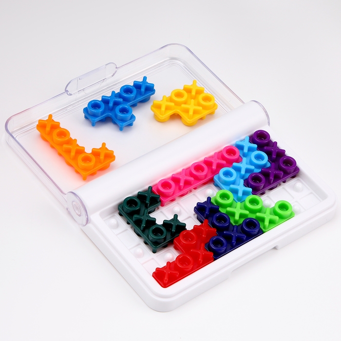 Выберите задание. Поместите детали головоломки на игровое поле указанным образом. Будьте внимательны! У каждой детали есть две стороны, когда на одной - Х, на другой- О. только о подходят к круглым выступам на игровом поле.