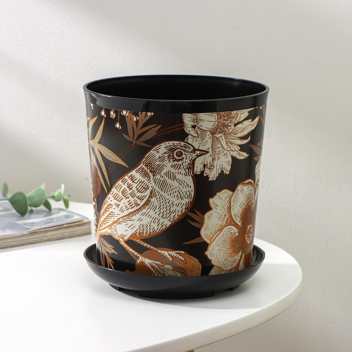 Горшок для цветов с поддоном Доляна «Голди.Птицы», 1,6 л, d=14 см, h=15,5 см, цвет чёрный