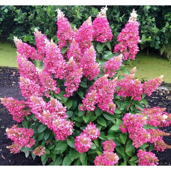Используется в одиночных и групповых посадках, в миксбордерах. Высота куста 2-2,5 метра. Кустарник покрывают крупные сочно-зеленые листья эллиптической формы, с заостренной вершиной. В период цветения на серо-коричневых побегах гортензии этого сорта формируются пышные конусовидные соцветия (метелки), покрытые мелкими душистыми цветками.Первоначально цветки имеют бело-бежевую окраску, со временем сменяющуюся на насыщенно-розовую. Средняя длина соцветий у гортензий этого сорта составляет около 30 сантиметров.