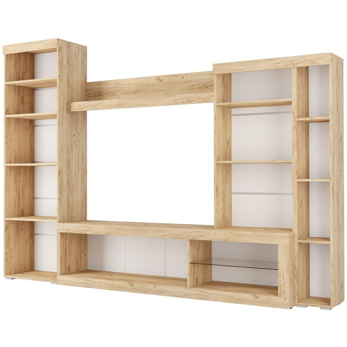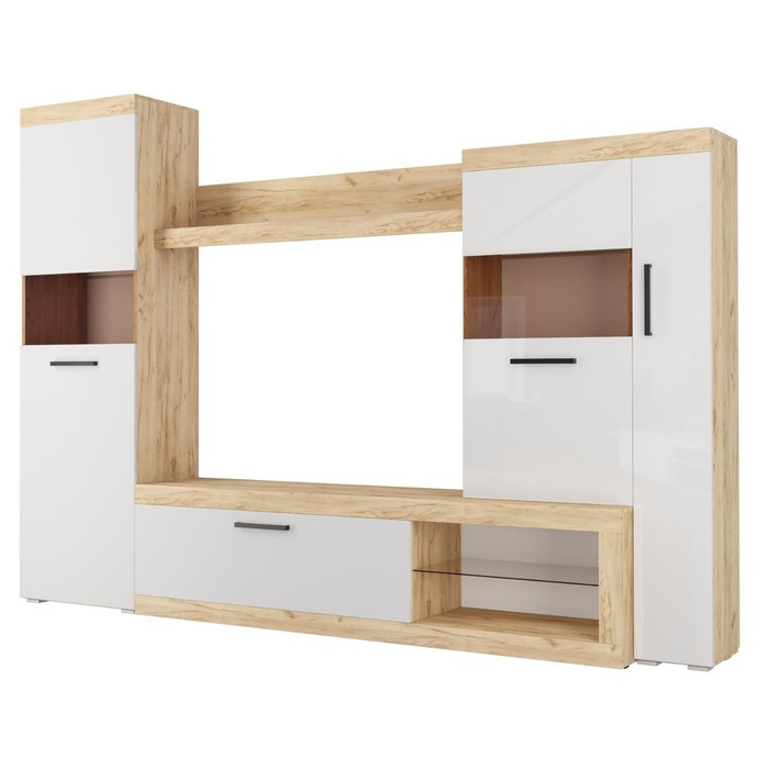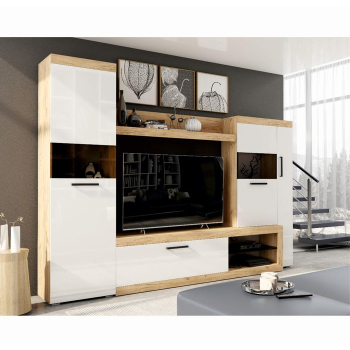 Гостиная БАСТОН – это практичный вариант для обустройства стильной комнаты. Открытые ниши и закрытые отделения предоставят достаточно места для размещения абсолютно всех вещей: посуды, книг и предметов декора. Для телевизора предназначена широкая зона по центру. Сочетание корпуса изделия в древесных оттенках и глянцевых фасадов со вставками делают мебель яркой и современной.