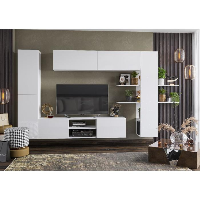 Гостиная Порту, Белый глянец/Белый глянец - это стильный и современный способ обустроить гостиную. Гостиная Порту отличается элегантным дизайном с чистыми линиями и простой, но стильной цветовой палитрой. В составе комплекта: тумба ТВ (дверцы оснащены механизмом Push Open), пенал с 2 дверцами и 2 полками, модуль с открытыми полками, антресоль с подъемными дверцами, оборудованными газ-лифтами.