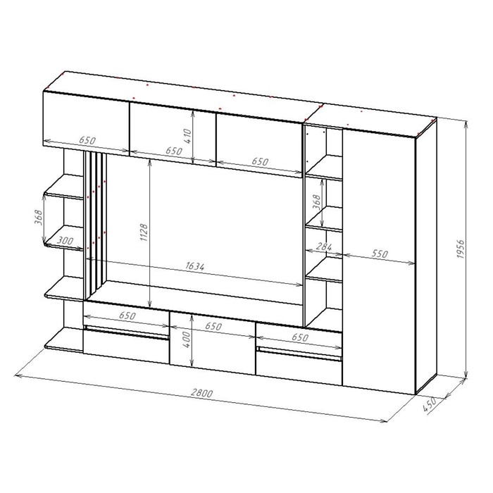 - Тумба под ТВ. Размер ниши для телевизора: 1634х1138.Тумба с 3-мя отделениями. Два отделения с ящиками (по два ящика), среднее отделение с дверкой.