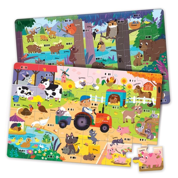 В игровом наборе «На ферме. В лесу» ребёнок найдёт говорящего робота со сканером штрихкодов и 2 пазла из 24 и 35 элементов.