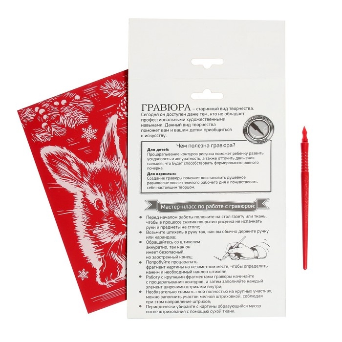 Гравюра представляет собой многослойное панно, покрытое красной краской, на которое нанесён контур рисунка. С помощью особого скребка (штихеля), который входит в набор, путём процарапывания и создается гравюра.