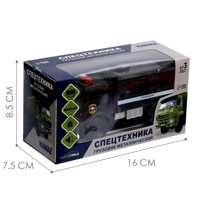 Лицензионная модель КамАЗ «Автоград» — детально проработанный транспорт спецслужб. Машинка дополнит игрушечный автопарк и станет прекрасным подарком для маленького любителя техники.
