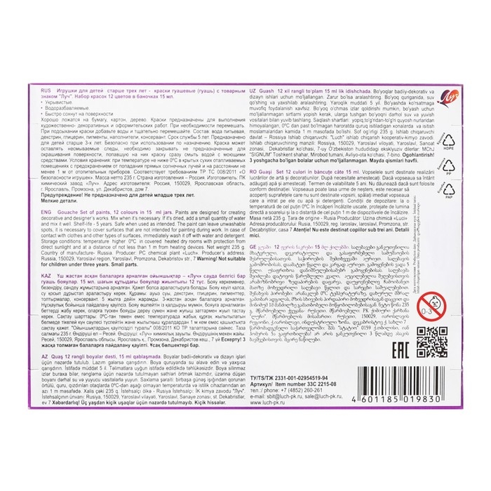 Гуашь 12цв*15мл Луч "Аниме" (сиреневая)