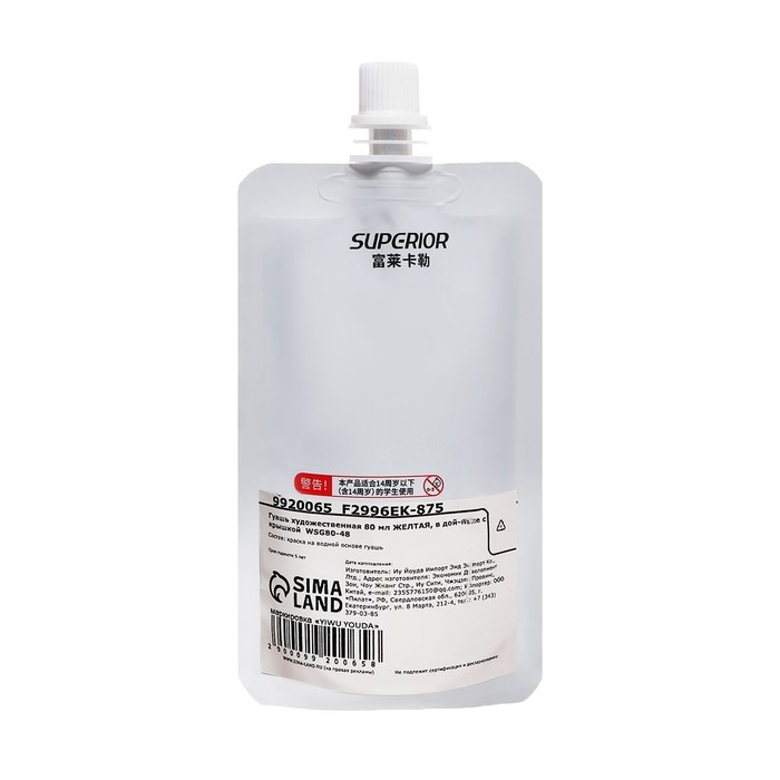 Гуашь художественная 80 мл, в дой-паке с крышкой, желтый