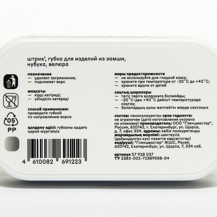 Губка для сухой чистки изделий из замши, нубука, велюра.