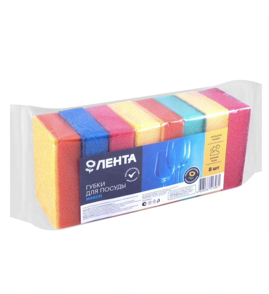 Флоу-пак. Губки для посуды ЛЕНТА Макси изготовлены из высококачественного поролона и абразива. Мягкий поролоновый слой для деликатного мытья, жесткий абразивный – для сильных загрязнений.