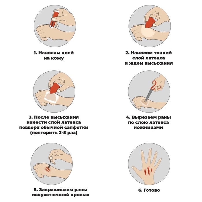 Жидкий латекс можно наносить поролоновым спонжем, пальцем, текстурной губкой или пипеткой в зависимости от нужного эффекта. После высыхания латекс становится прозрачным и блестящим. Чтобы убрать блеск, достаточно припудрить латекс прозрачной фиксирующей пудрой. Чем толще слой, тем дольше время высыхания.