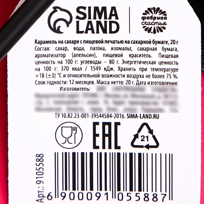 Состав: сахар, вода, патока, изомальт, сахарная бумага, ароматизатор (апельсин), пищевой краситель.