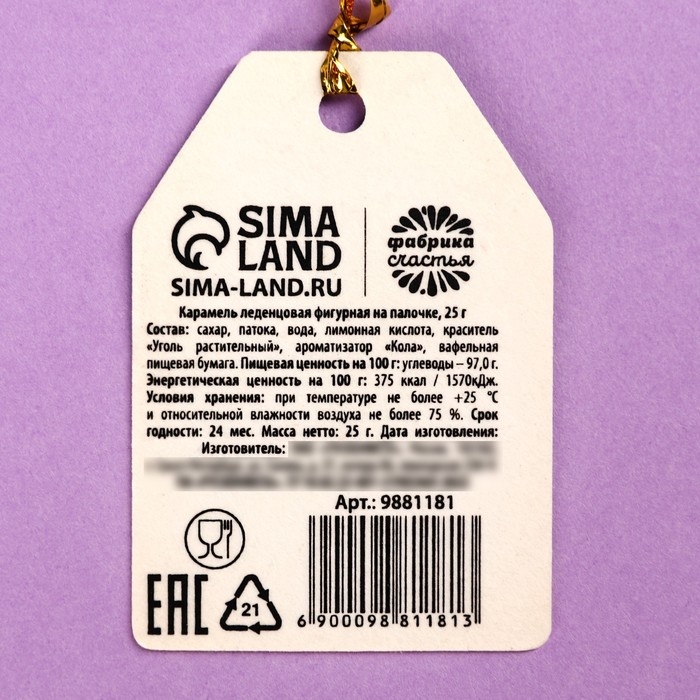 Состав: сахар, патока, вода, лимонная кислота, краситель "Уголь растительный", ароматизатор "Кола", вафельная пищевая бумага.