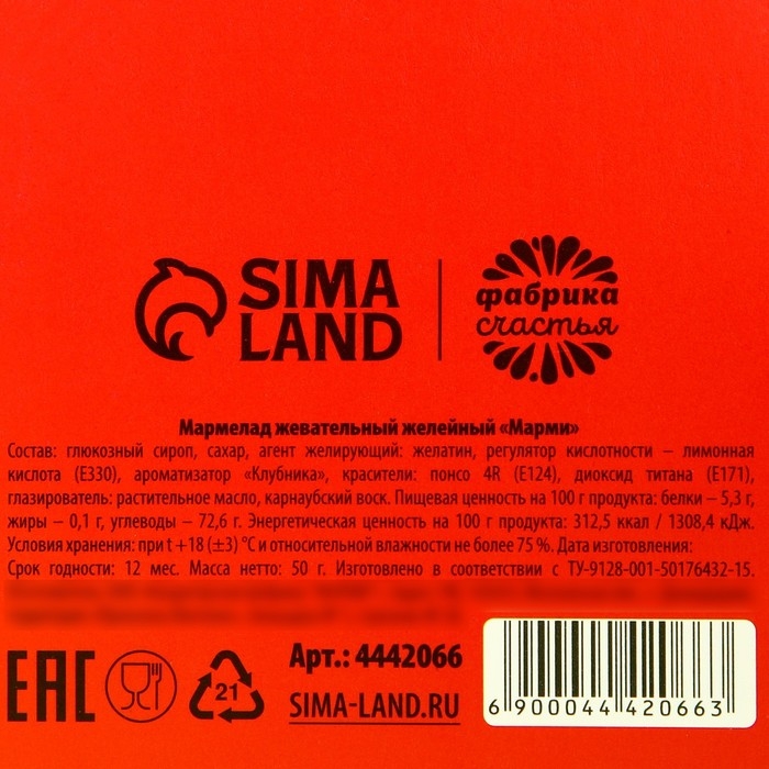 Состав: глюкозный сироп, сахар, агент желирующий: желатин, регулятор кислотности – лимонная кислота (Е330), ароматизатор: «Клубника», красители: понсо 4R (Е124), диоксид титана (Е171), глазирователь: растительное масло, карнаубский воск.