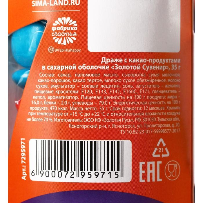 Состав: сахар, пальмовое масло, сыворотка сухая молочная, какао-порошок, какао тертое, молоко сухое обезжиренное, молоко сухое, эмульгатор – соевый лецитин, соль, загуститель – желатин, пищевые красители: Е120, Е133, Е141, Е160С, Е171, глянцеватель – капол, ароматизатор.