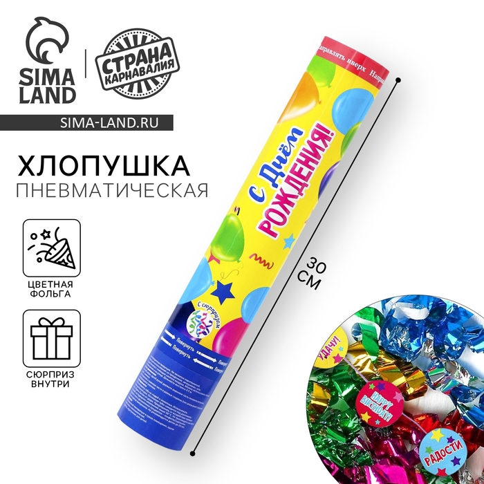 Хлопушка пневматическая «С Днём Рождения», 30 см, с сюрпризом