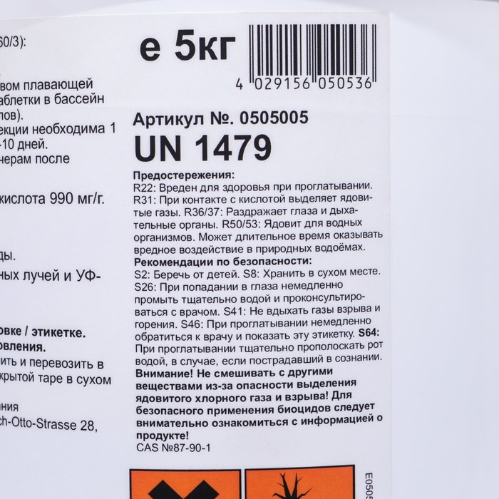 Меры предосторожности: соблюдайте меры по безопасности, указанные на этикетке продукта и в паспорте безопасности. Продукт хранить в оригинальной упаковке в прохладном и защищённом от солнца месте. Продукт хранить и перевозить стоя! Внимание: Не смешивать с другими химикатами! При смеси с другими хлорными продуктами опасность выделения ядовитых газов и взрыва!