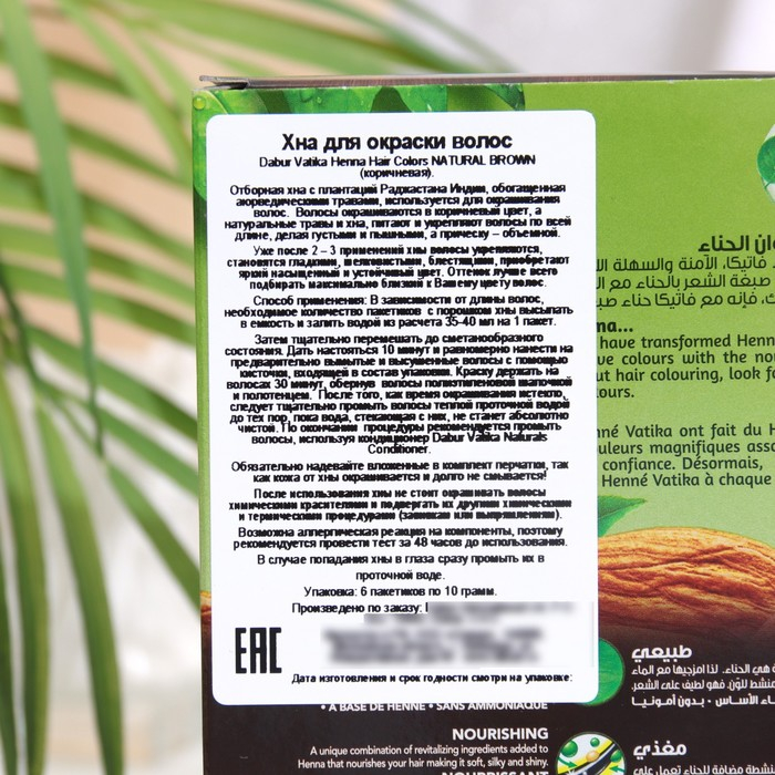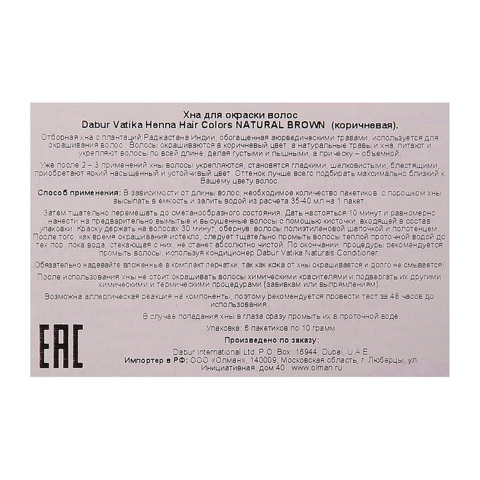 Хна для волос коричневая VATIKA HENNA HAIR COLOURS BROWN, 6 пакетиков по 10 г