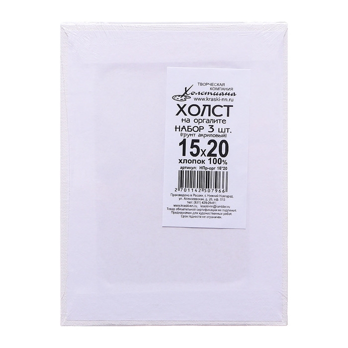 Холст на оргалите 15х20см, 4мм, хлопок 100%, акриловый грунт, мелкое зерно 210г/м2, в наборе 3 штуки