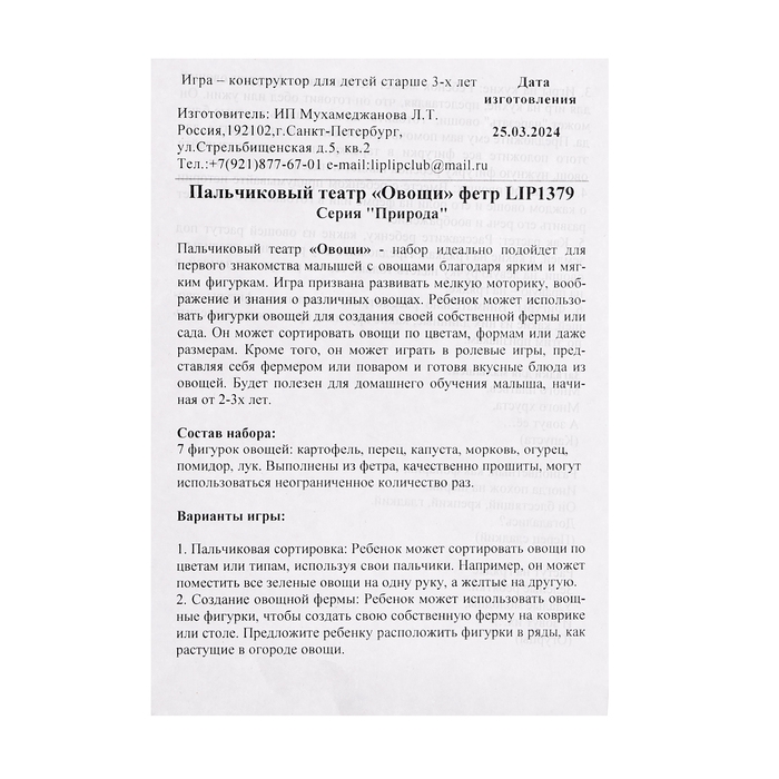 Игра — конструктор «Овощи», 7 деталей