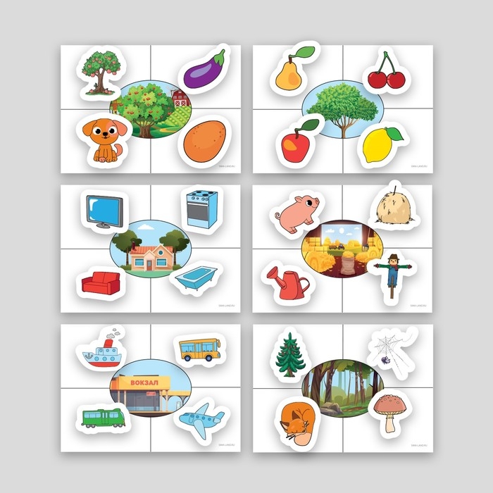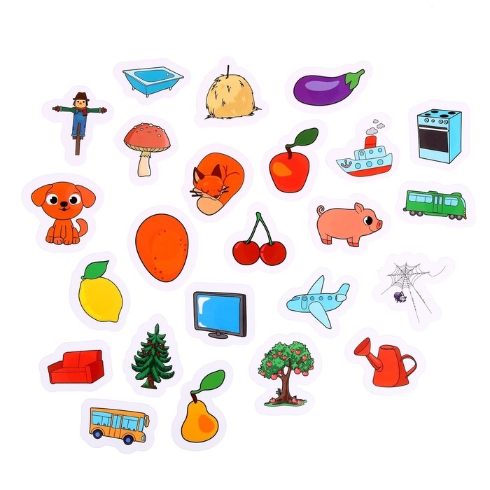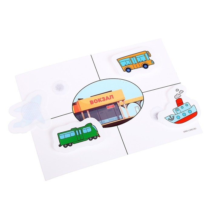 - Задача малыша — найти липучки с предметами, которые подходят к заданной тематической картинке на игровом поле, и прикрепить их на поле.