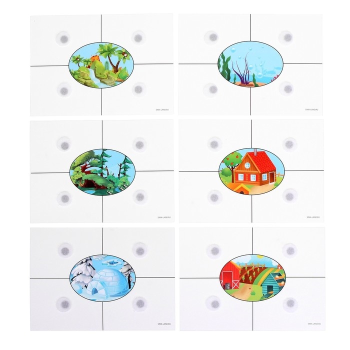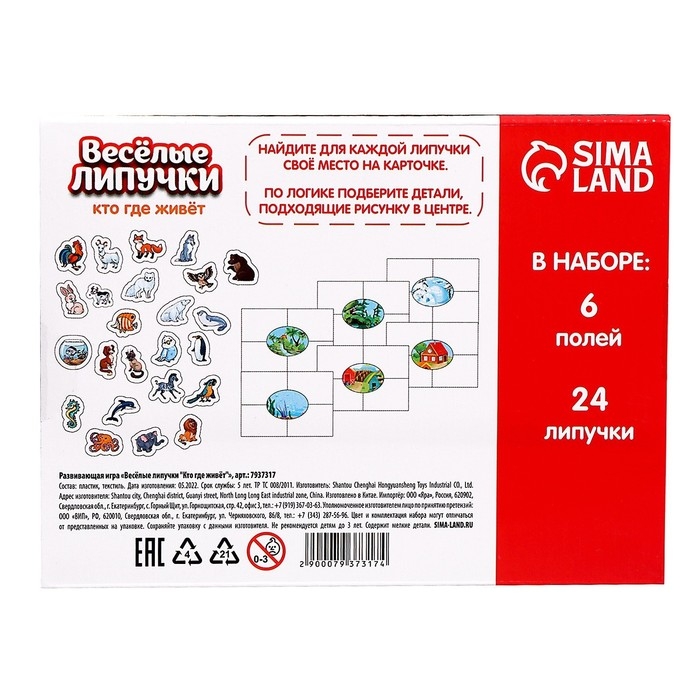 - Задача малыша — подобрать каждому зверьку правильное место обитания и прикрепить нужную липучку на правильное поле с локацией.