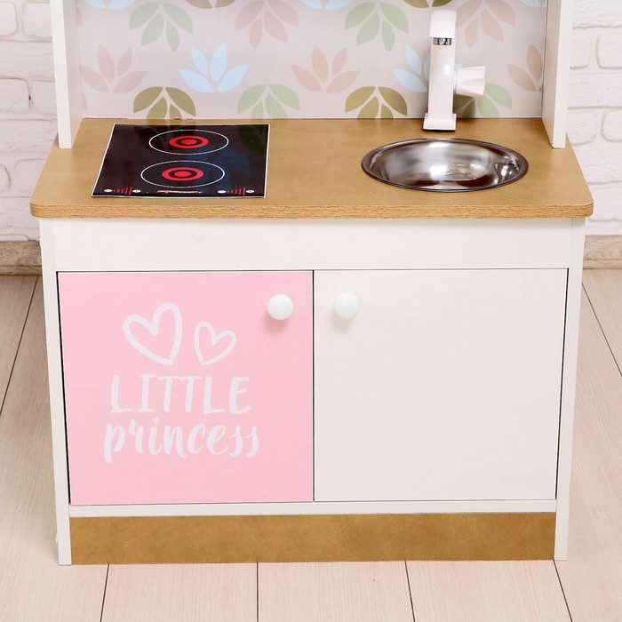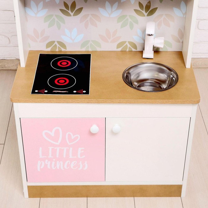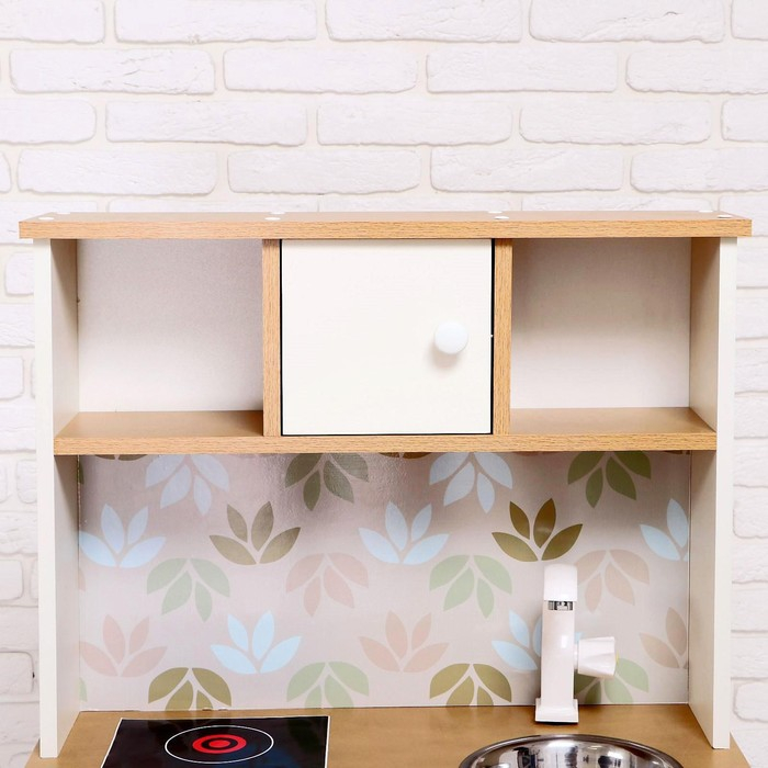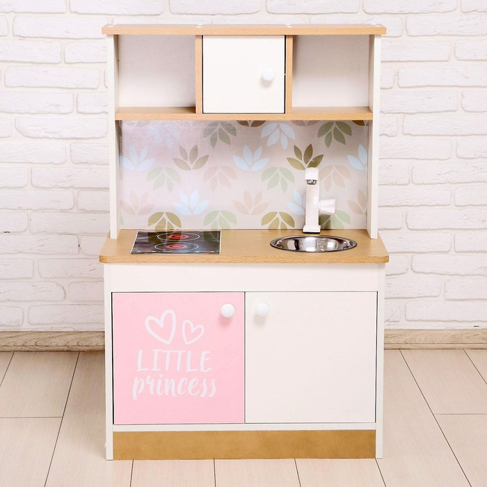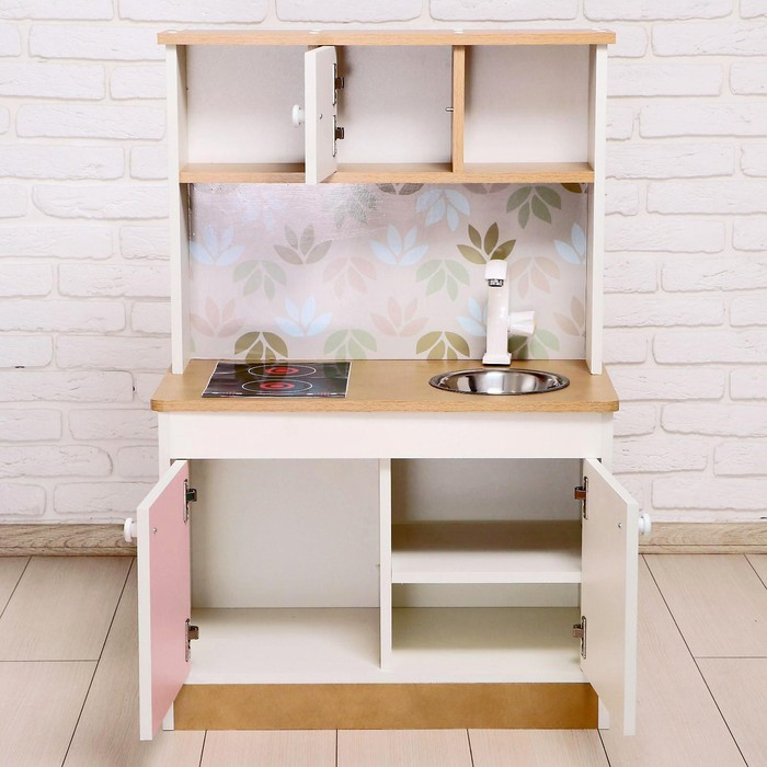 Игровая мебель «Детская кухня», цвет корпуса бело-бежевый, цвет фасада бело-розовый, фартук цветы