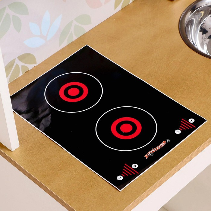 - Плита с двумя конфорками выполнена в виде наклейки — безопасно даже для малышей.
