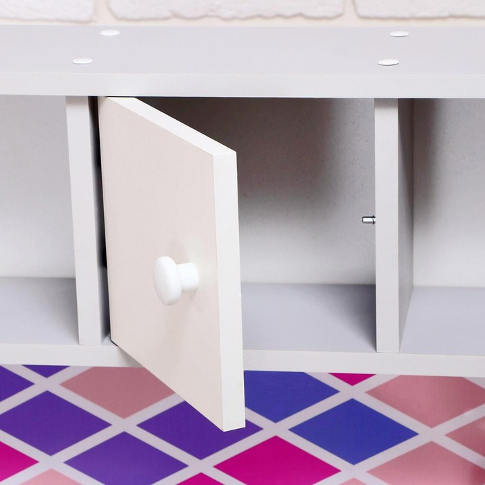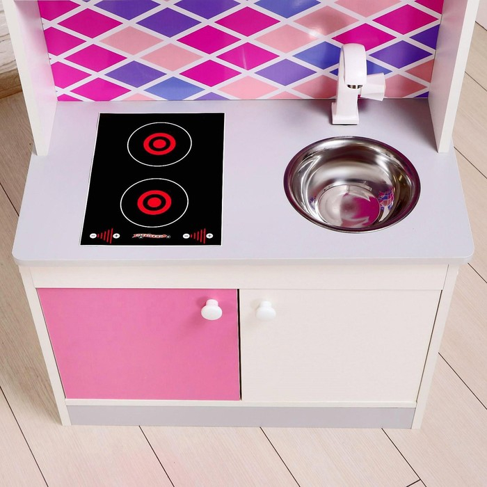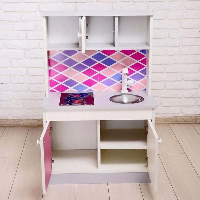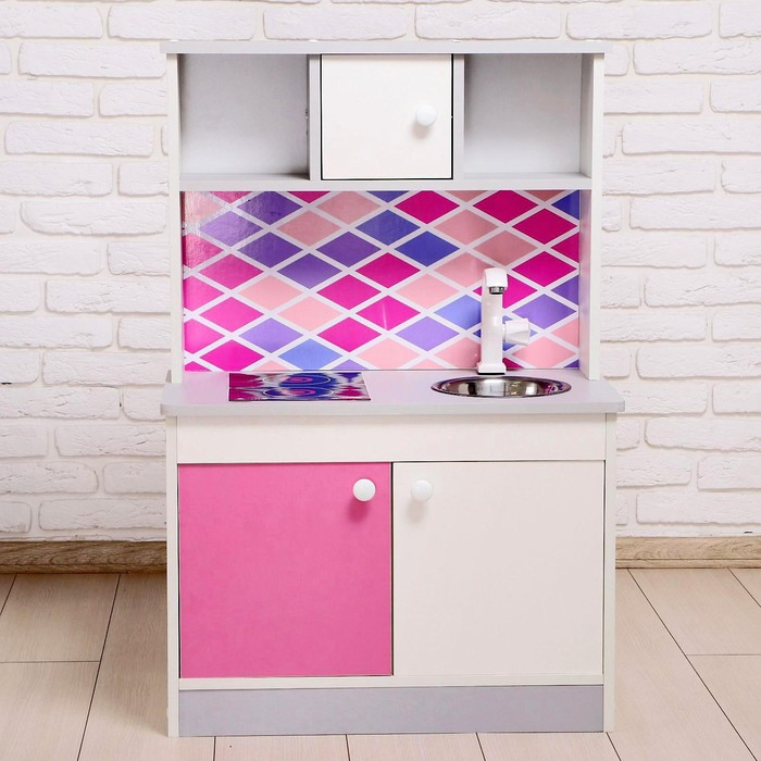 Игровая мебель «Детская кухня», цвет корпуса бело-серый, цвет фасада бело-малиновый, фартук ромб