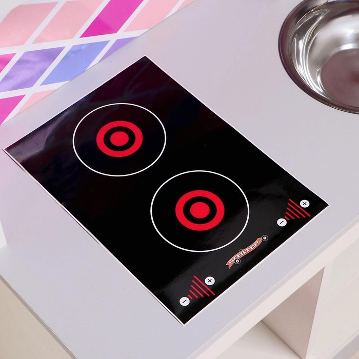 - Плита с двумя конфорками выполнена в виде наклейки — безопасно даже для малышей.