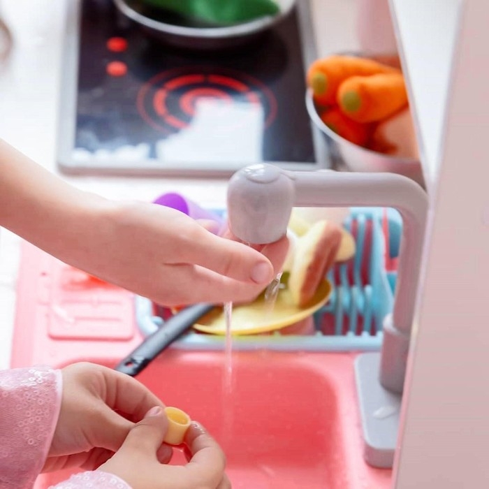 - Детская кухня оснащена реалистичными краном и мойкой с функцией подачи воды. В мойке слива нет. Вода возвращается в кран благодаря насосу и двойному дну. Объём воды — 1–1,5.