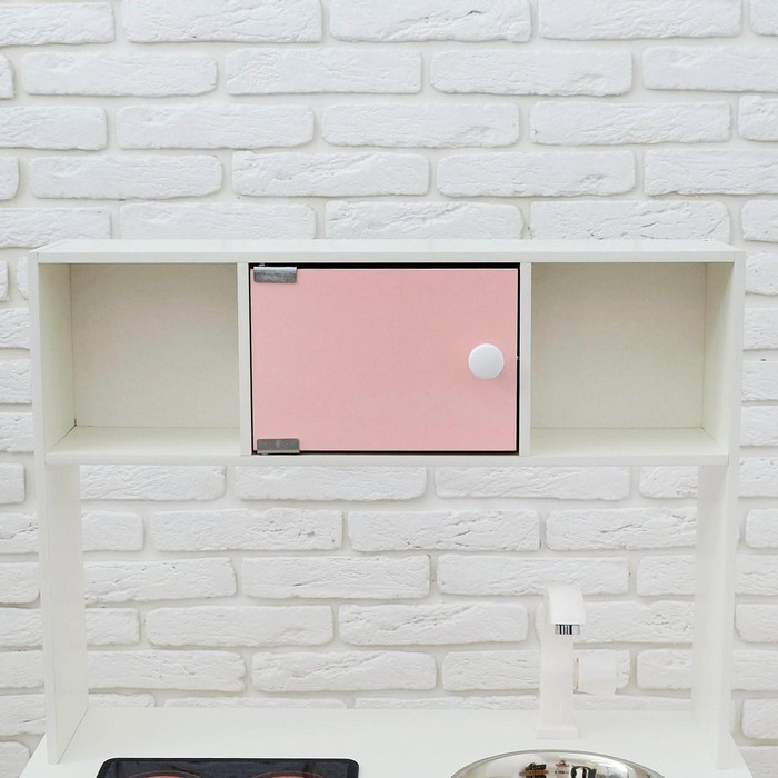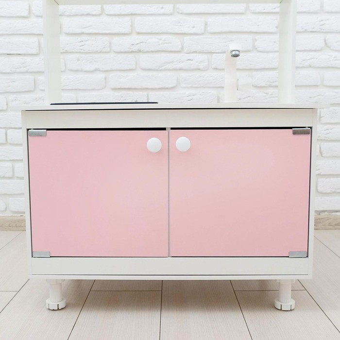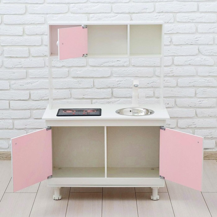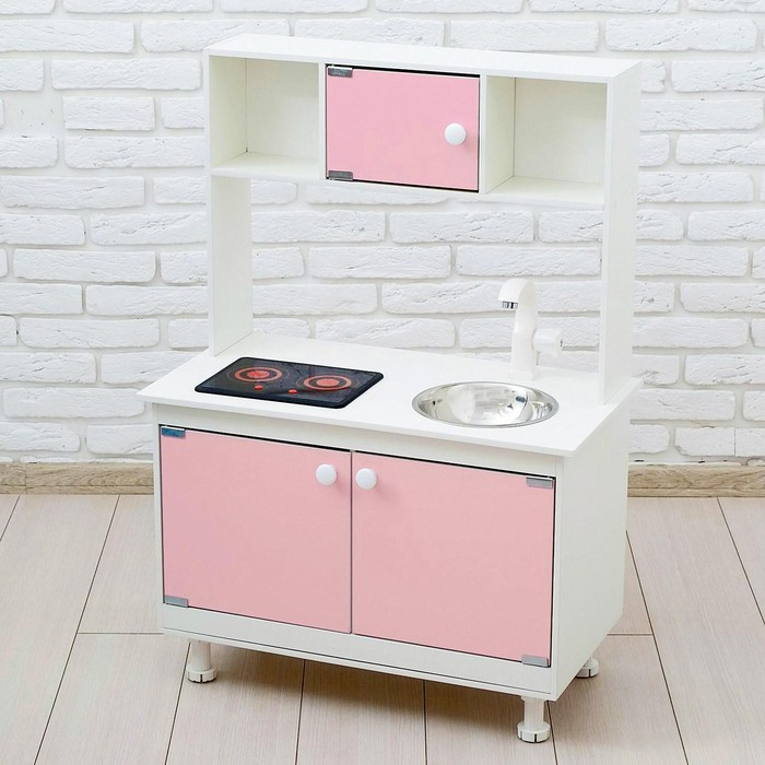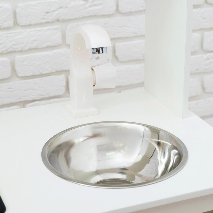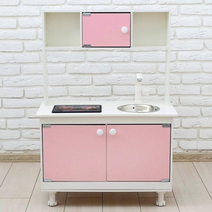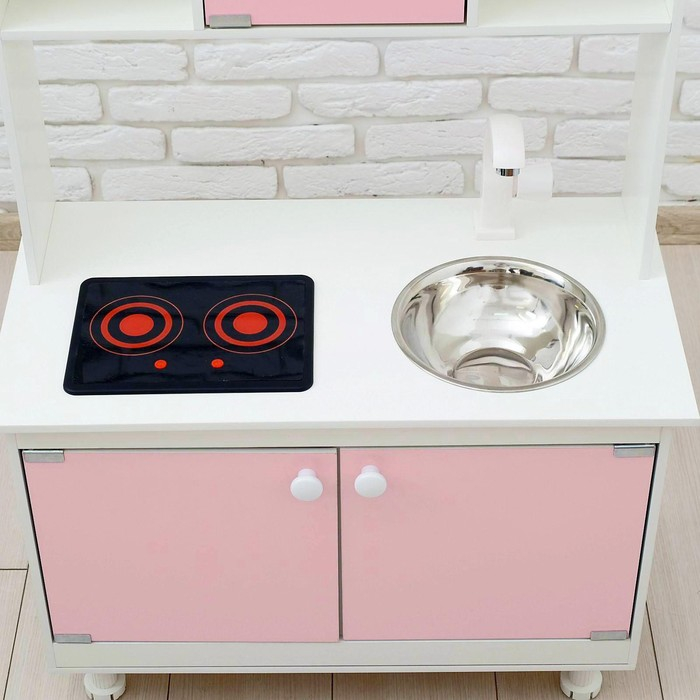 - Детская кухня оснащена реалистичными краном и мойкой из пищевой нержавеющей стали. У крана крутится вентиль, вода не бежит.