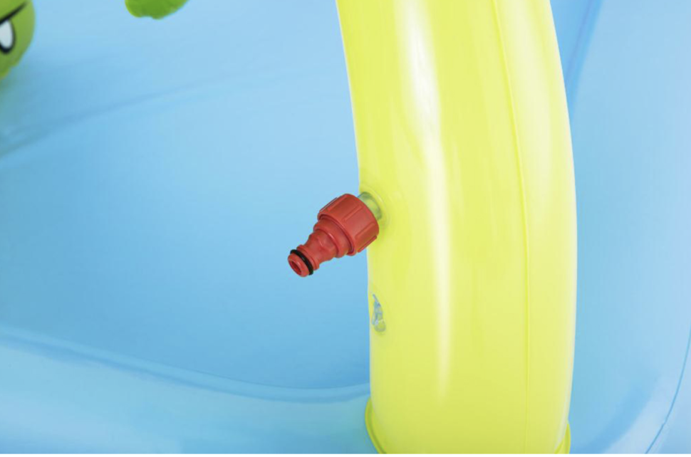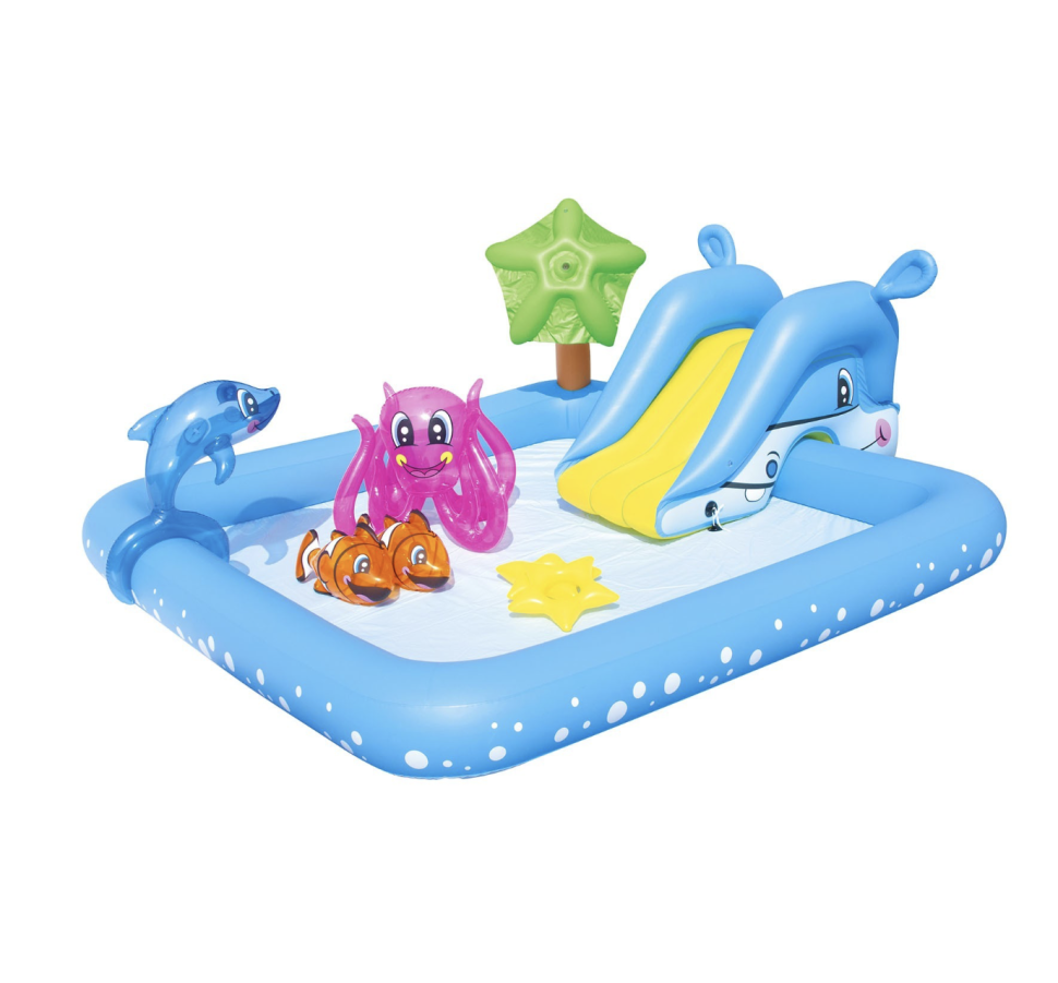 Игровой бассейн станет любимым местом веселой детворы летом на свежем воздухе. На площадке есть горочка, различные надувные игрушки в виде морских обитателей и чудесный фонтанчик. Бассейн и игрушки выполнены из прочного винила. Внутренний диаметр клапана бассейна 10 мм. Накачивается стандартным ручным или ножным насосом для надувных кругов и игрушек (не использовать воздушный компрессор высокого давления). Надувные дельфин и осьминог выполнены из цветного полупрозрачного винила, очень яркого и замечательно блестящего. Надувная горка привязывается шнурком через люверсы. Разбрызгиватель подводится через пальму и ребят ждет освежающий фонтанчик.