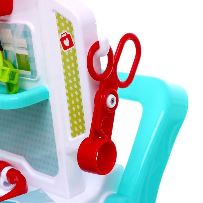 - На столике удобно располагаются все необходимые для проведения обследования инструменты. Фонендоскоп, термометр, шприц, коробочки с лекарствами, молоточки и другие медицинские аксессуары помогут ребенку больше узнать о профессии.