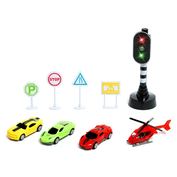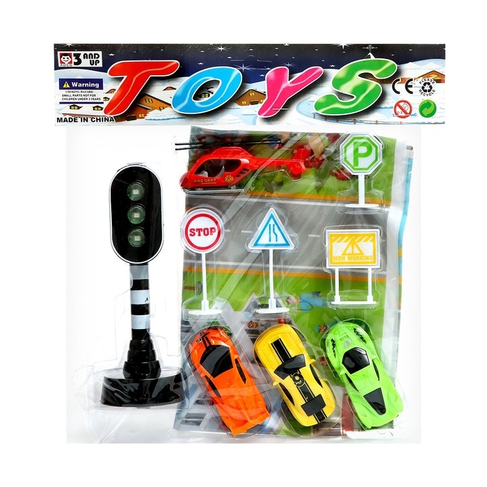 Игровой набор «Дорожные знаки», в наборе игровое поле, знаки, 3 машинки, вертолет, цвет МИКС