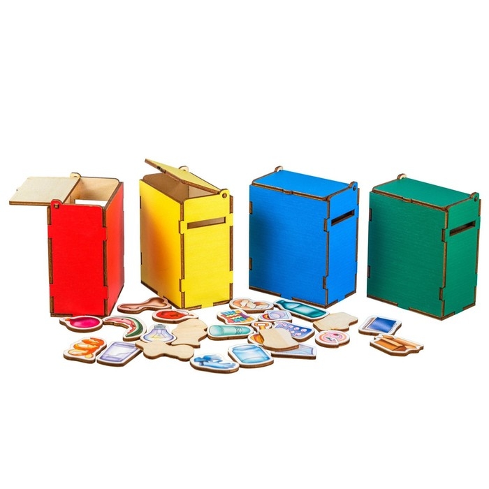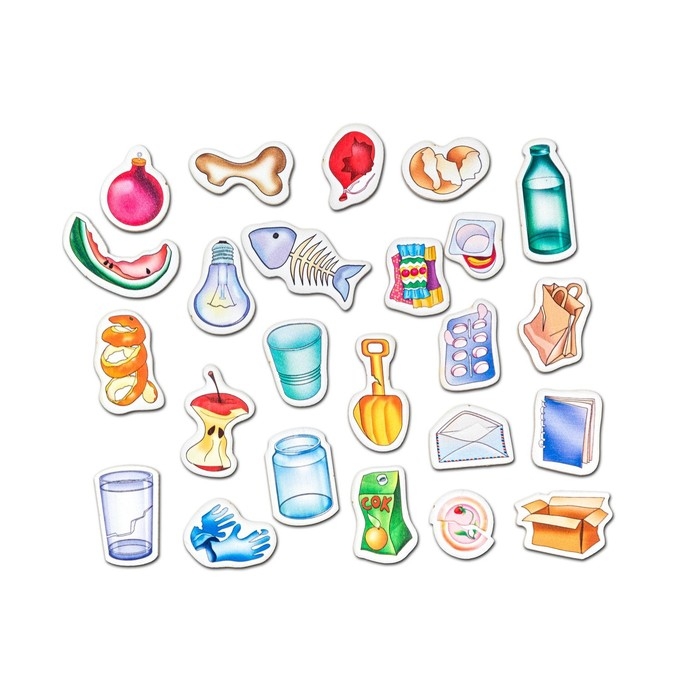 - Предложите ребёнку правильно распределить мусор по контейнерам: в красный контейнер — изделия из пластика, в зелёный — органические продукты, в жёлтый — всё, что изготовлено из бумаги, в синий — стеклянные предметы. Просите при этом объяснять свой выбор: называть материал, из которого сделан предмет.