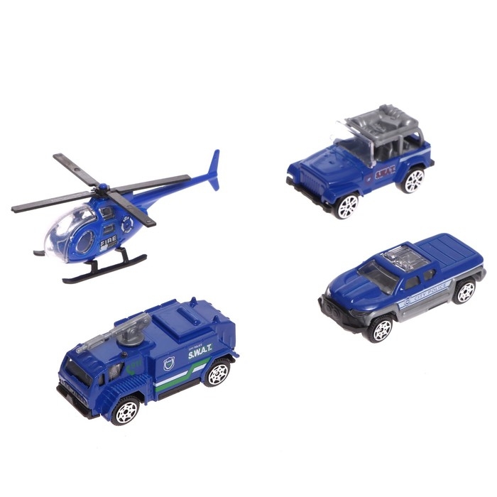 - В комплект входит 3 полицейских машинки и 1 вертолёт.