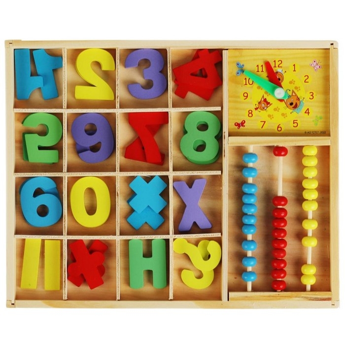 - Набор содержит цифры, часы и счёты, что способствует изучению чисел и их количественного представления.