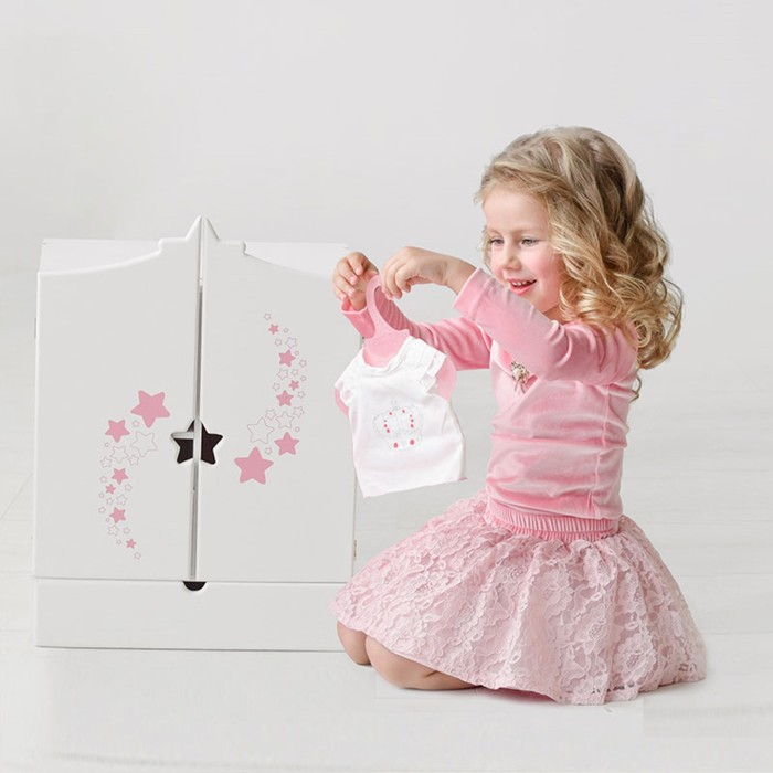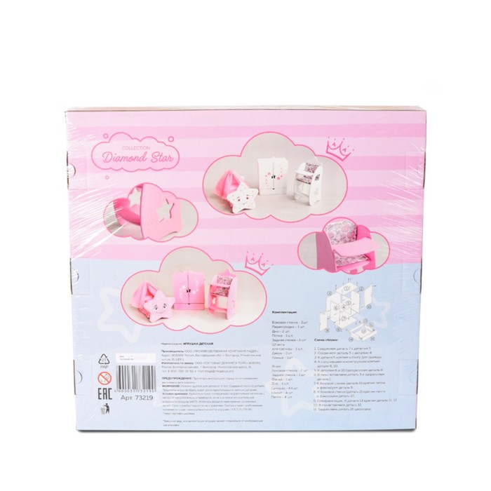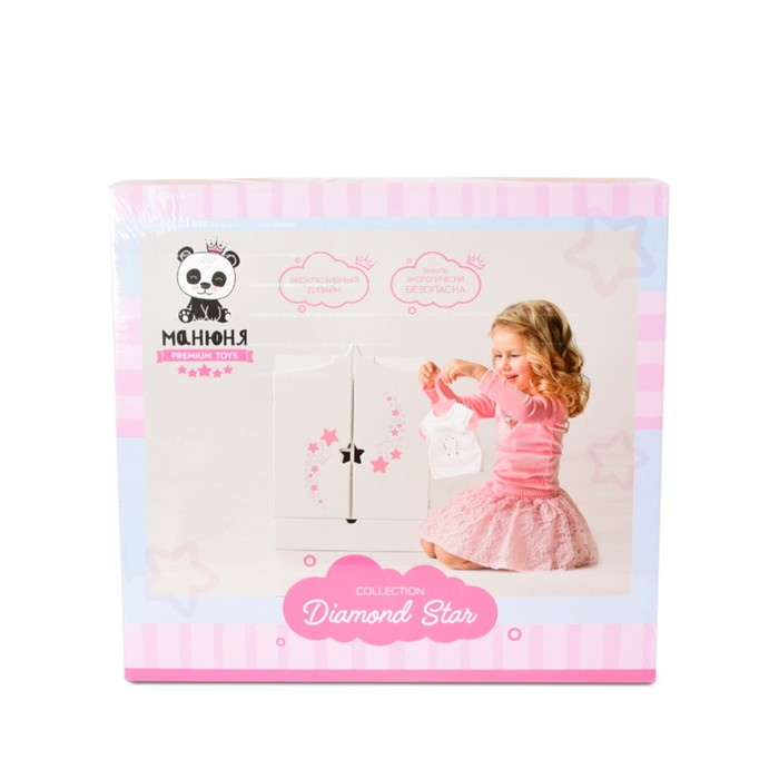 Кукольный шкаф из коллекции Diamond Star — хорошее решение для хранения кукольной одежды и аксессуаров. Одна сторона шкафа имеет штангу для подвеса вешалок, а другая — полки для хранения вещей и принадлежностей. Внизу имеется выдвижной ящик. Стильный дизайн шкафа впишется в любую комнату маленькой принцессы.