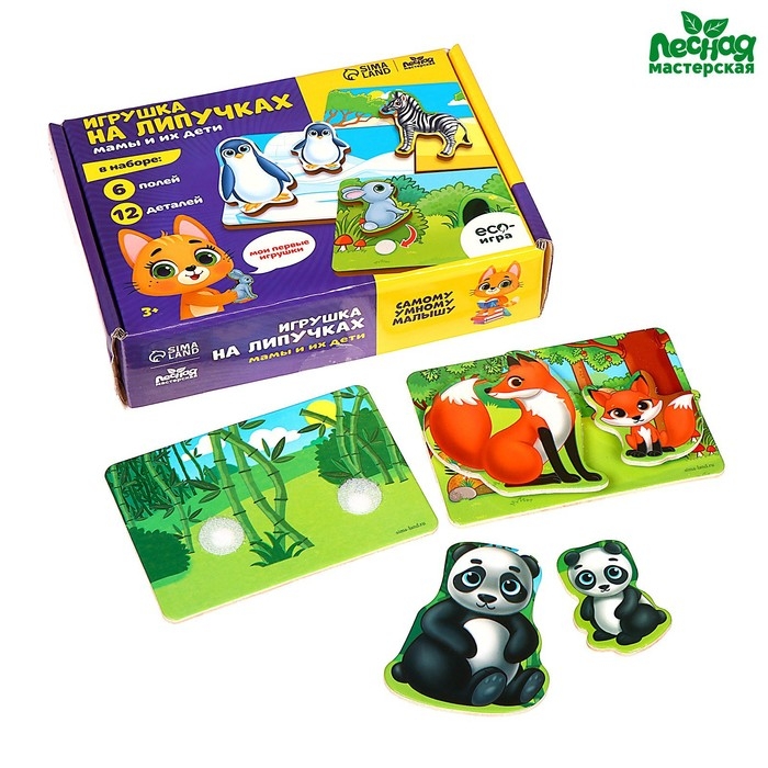 Игрушка на липучках — это развивающая игра, созданная специально для малышей. Набор включает в себя 6 полей и 12 деталей, которые познакомят ребёнка с животным миром.