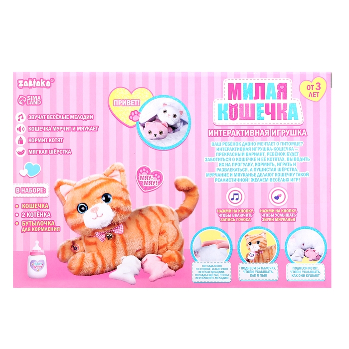 Интерактивная игрушка «Милая кошечка» привлечёт внимание своими интерактивными функциями и надолго займёт малыша. Игра с питомцами прививает любовь к животным, обучает правилам ухода за ними. Взаимодействуя с кошкой и котятами, ребёнок тренирует мышление, слуховое и визуальное восприятие.