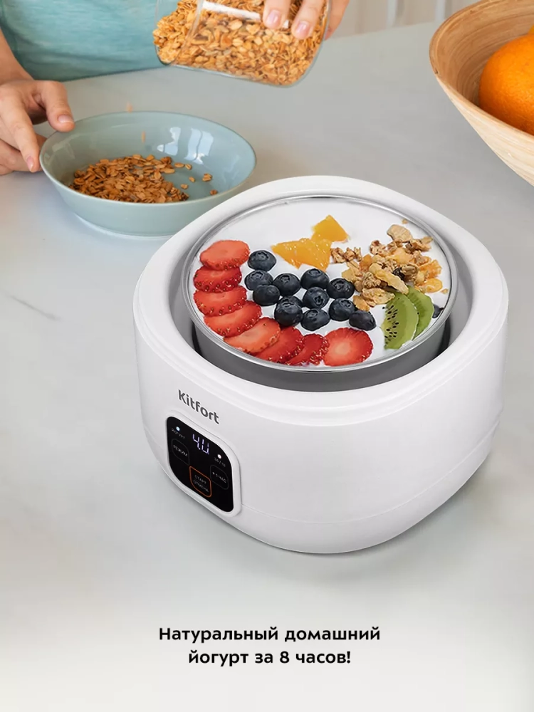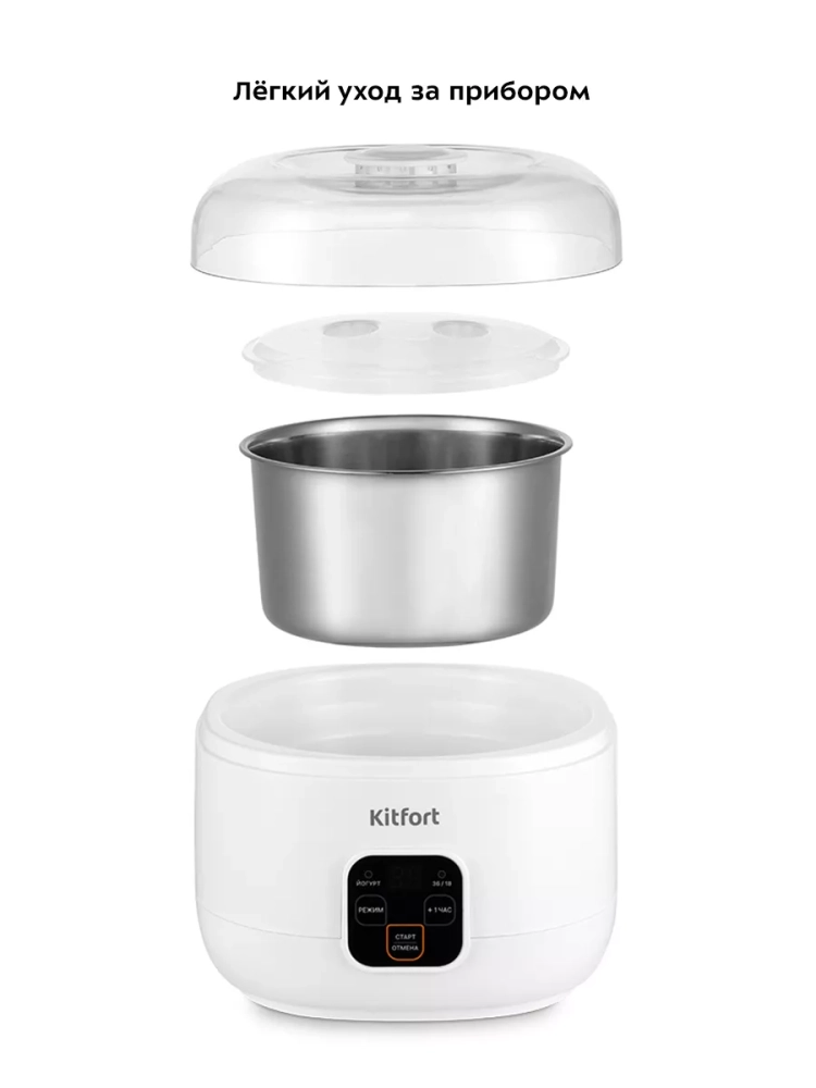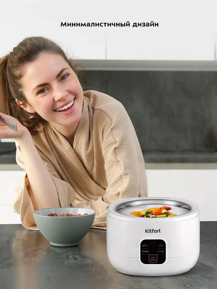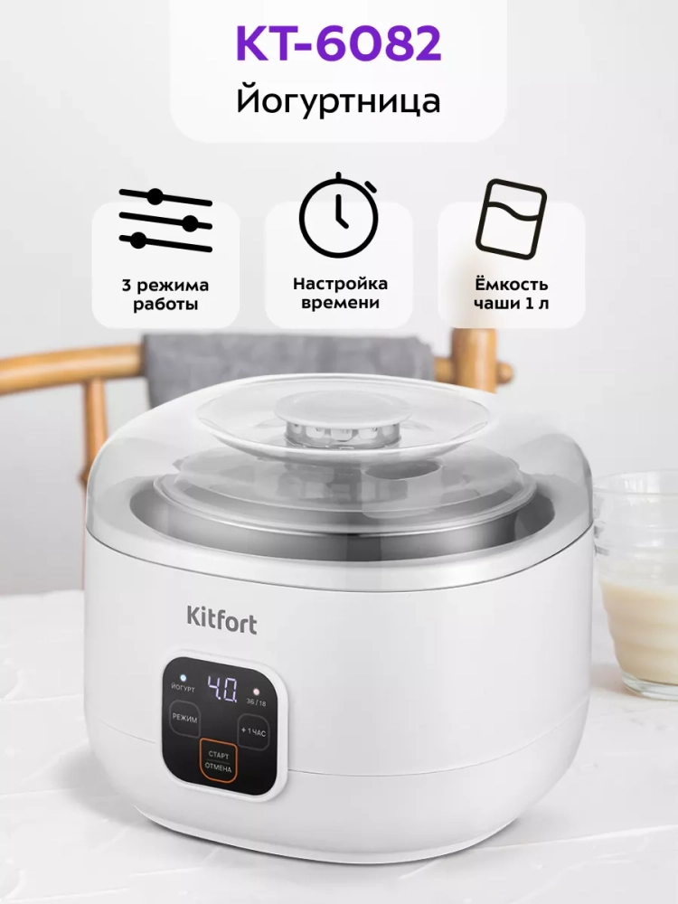 Йогуртница Kitfort КТ-6082 предназначена для приготовления вкусного и полезного домашнего йогурта, а также творога, питьевого йогурта или любого другого молочного продукта. В йогуртнице предусмотрены три режима приготовления, на каждом из которых вы можете настроить время работы.