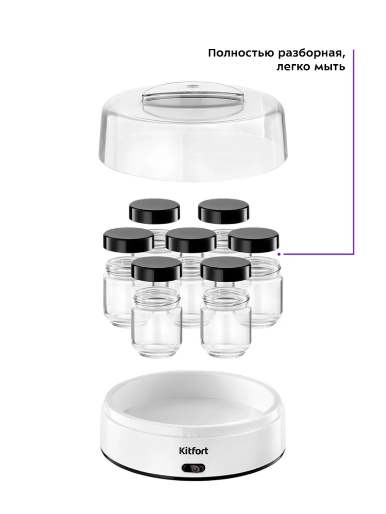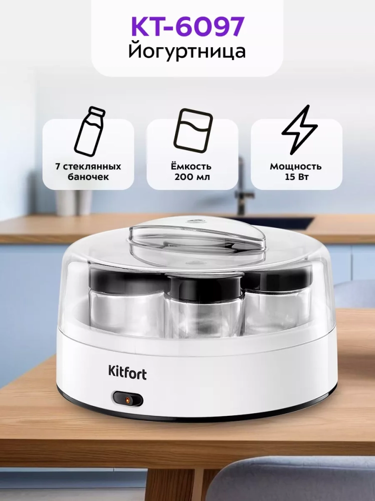 Йогуртница Kitfort КТ-6097 предназначена для приготовления вкусного и полезного домашнего йогурта. Прибор укомплектован 7 стеклянными баночками по 200 мл каждая, в которых готовый йогурт можно хранить в холодильнике. Йогуртница равномерно нагревает баночки с ингредиентами, поддерживая заданную температуру.