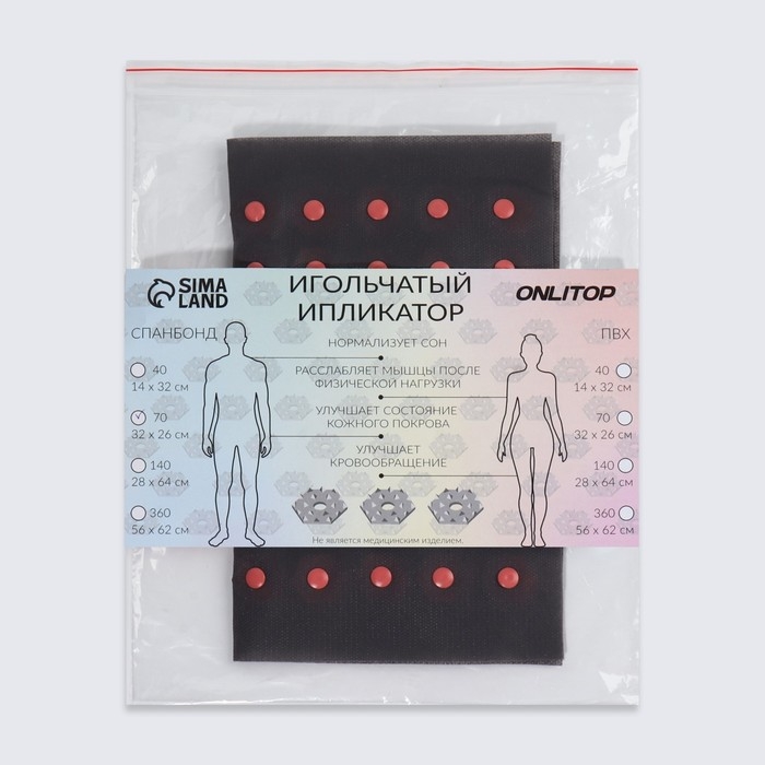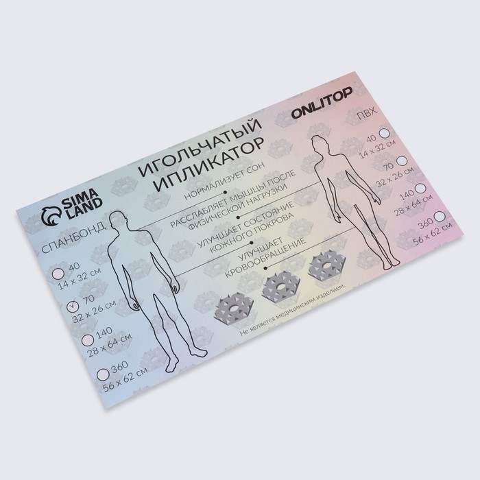 Ипликатор-коврик представляет собой основание, на котором закреплены модули с иглами из качественного пластика. Изделие предназначено для выполнения точечного массажа с целью повысить общий тонус организма через воздействие на различные части тела.